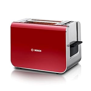 Bosch Kompakt Toaster Styline TAT8614P, integrierter Edelstahl-Brötchenaufsatz, mit Auftaufunktion und Aufwärmfunktion, perfekt für 2 Scheiben Toast, breit, Liftfunktion, Brotzentrierung, 860 W, rot