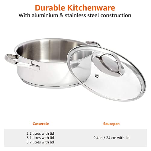 Das neun teilige Edelstahl-Kochgeschirr-Set enthält eine 20 x 7,7 cm (2,2 l) große flache Kasserolle mit Deckel, eine 16 x 9,87 cm (1,9 l) große Kasserolle mit Deckel, eine 20 x 10,4 cm (3,1 l) große Kasserolle mit Deckel, eine 24 x 12,7cm (5,7 l) große Kasserolle mit Deckel, und eine 16 x 9,35 cm (1,7 l) große offene Kasserolle