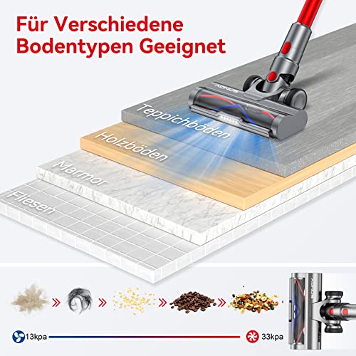 【33Kpa+500W bürstenloser Motor】: Verwendet einen effizienten bürstenlosen Motor, der eine starke Saugkraft von 33Kpa und eine hohe Leistung von 500W erzeugt und verschiedene Oberflächen und eingebetteten Staub tief reinigen kann.