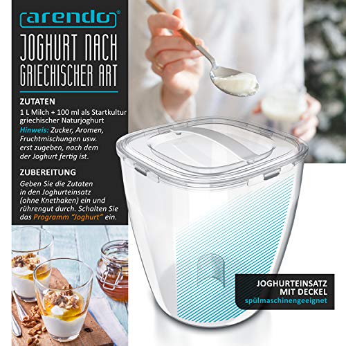 Der Lieferumfang umfasst ein großes Paket an Zubehör: Backform, Joghurteinsatz mit verschließbarem Deckel, Knethaken, Knethakenentferner, Dosierlöffel und Messbecher sind bereits enthalten, damit Sie alle Teile griffbereit haben und sofort loslegen können.