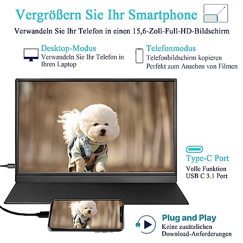 【1080P FHD Portable Monitor für Laptop】– Mit 15,6 Zoll 1920*1080 Auflösung fortschrittlichen IPS glänzenden Bildschirm unterstützt unser tragbarer Laptop Monitor 178° vollen Betrachtungswinkel, es gibt genaue und helle Farben, zieht Sie in das Video oder Spiel mit lebensechten Farben und erstaunlichen Details. Wie ein PC-ComputerGaming-Telefon-Anschluss Laptop-Monitor-Extender, kein Splash-Bildschirm oder stecken, Augenpflege, Vermeidung visueller Ermüdung für langfristige Betrachtung
