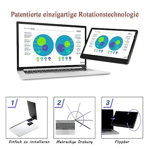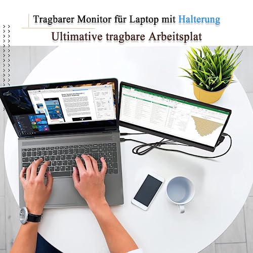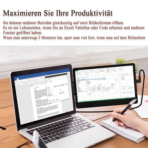 Verbessern Sie die Arbeitseffizienz jederzeit und überall — Dieser tragbare Monitor ist leicht, bleibt an Ihrem Laptop befestigt und benötigt keinen Tisch, so dass Sie überall mit zwei Bildschirmen arbeiten können.