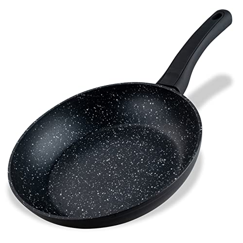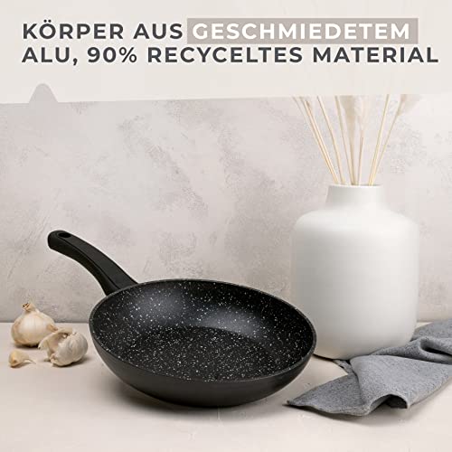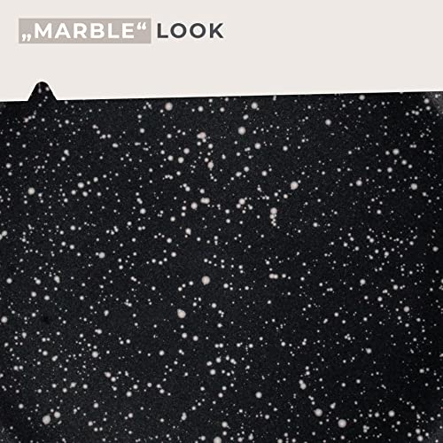 HOCHWERTIG VERARBEITET AUS BESTEN MATERIALIEN – Die Servierpfanne ist zu mehr als 90% aus recyceltem Aluminium, der ergonomische Griff mit Flammschutz ist aus hochwertigem Kunststoff – In modernem Anthrazit im Marmor-Design überzeugt die Pfanne in jeder Küche