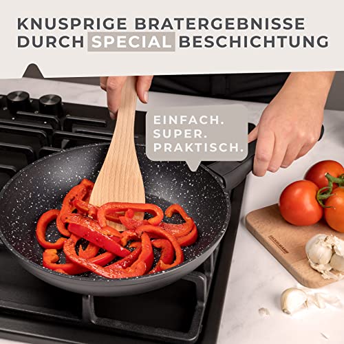 FÜR ALLE HERDARTEN GEEIGNET AUCH INDUKTION – Die Aluminiumpfanne eignet sich für jeden Herd – Durch den funktionsverstärkten Induktionsboden ist die beschichtete Pfanne ideal für Induktionskochfelder und den Induktionsherd