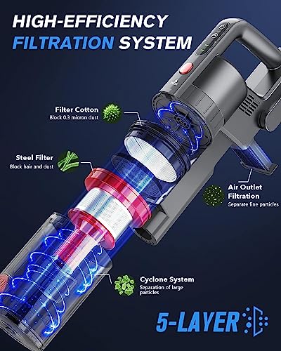 Leistungsstarkes Saug- und verbessertes effizientes Filtersystem. Der Staubsauger ist mit 2 Saugmodi ausgestattet und das 5-stufige effiziente Filtersystem zur Reinigung von 99,97 % der mikroskopischen Staubpartikel bis zu 0,3 Mikrometer.