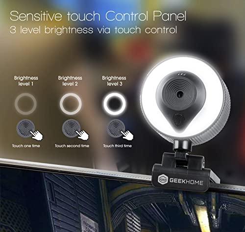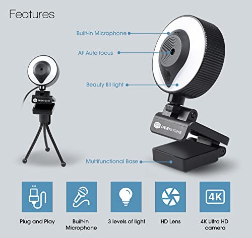 Geekhome Universal 4K Webcam – 4K UHD Kamera mit Mikrofon (3840×2160 Pixel, 30 fps) für Windows, Mac, Android, Ringlicht, Sony Sensor, Autofokus, perfekt für Streaming, HomeOffice, Online Unterricht