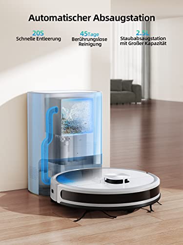 🙌【45 Tage ohne Reinigung】Der Q6 SE Saugroboter wird mit einer 2,5-Liter-Absaugstation geliefert, die bis zu 45 Tage Staub und Schmutz sammelt/lagert. Der Staubsauger Roboter wird innerhalb von 20S automatisch geleert, sodass Sie den Staubbehälter des Roboters nicht nach jeder Reinigung entleeren müssen. Die Entleerungsfrequenz kann über die App eingestellt werden, was die Reinigung noch einfacher macht.