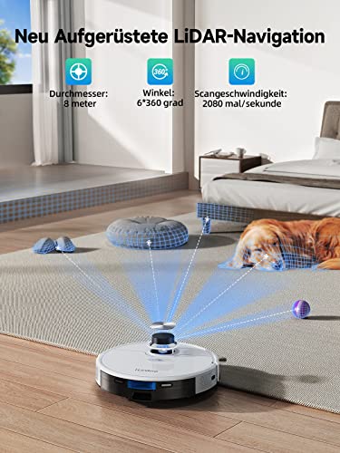 👍【Aktualisiertes Laser-Navigationssystem】Die verbesserte LiDAR 4.0-Navigationstechnologie, mit Messen von Fehlern auf MM-Ebene, ermöglicht es, Ihren Reinigungsbereich genau zu kartieren. Der Saug- und Wischroboter besitzt außerdem einen SLAM-Algorithmus (Echtzeit-Kartengenerierung) zur Auswahl des effizientesten Reinigungspfads. Ausgestattet mit 24 Sensoren bewältigt der Q6 SE problemlos komplexe Umgebungen und weicht Hindernissen mühelos aus.