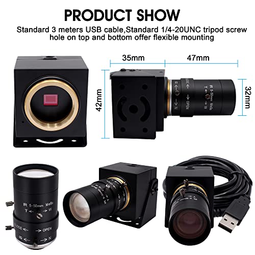 5–50 mm, 10-faches manuelles Zoomobjektiv: 4K 5–50 mm variable USB-Kamera sind hervorragend, gute Reichweite und Schärfentiefe von 5 bis 50 mm und Sie könnten so nah an einige Objekte kommen, es war fast Makro. Der manuelle Fokus ermöglicht Ihnen die Kontrolle zum Ein- und Auszoomen, Fokussieren und Einstellen der Blendengröße, um Ihrem Objekt Helligkeit zu verleihen und Sie können diese mit Hilfe von einigen Schrauben am Objektiv fixieren.