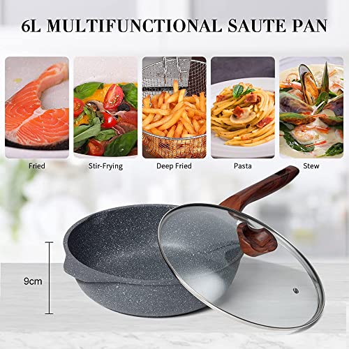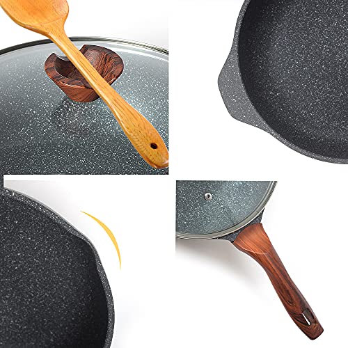 🍳【Natürliche Elemente】- Granitbeschichtung kombiniert mit Holzmaserung Griff. Wir sind bestrebt, diese Elemente zu verwenden, um die einfachsten Kochstile und die authentischsten Aromen von Lebensmitteln wiederherzustellen. Tipp: Griffe aus Kunstholz sind nicht für den Einsatz in Öfen geeignet.
