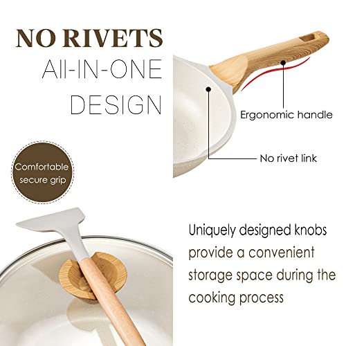 🎀【Durchdachte Designdetails】 Hitzebeständiger Griff aus Imitationsholz ist ergonomisch und angenehm zu halten; Nietenloses Inneres, um Haken und Lebensmittelansammlung zu verhindern; Belüftete gehärtete Glasdeckel halten die Sichtbarkeit aufrecht und fangen gleichzeitig genügend Wärme und Feuchtigkeit ein; Die Oberseite des Deckels kann zur Aufbewahrung verwendet werden, die zum Kochen oder vorübergehenden Umgang mit anderen Dingen bequem ist