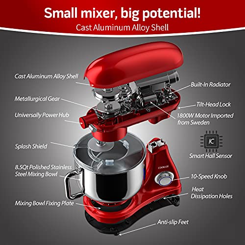 Küchenmaschine 1800W 8L COOKLEE 3 in 1 Elektrischer Metall Knetmaschine Standmixer 10+1 Geschwindigkeit Lebensmittelmixer Teigmixer mit Teighaken, Schüssel, Schläger, Schneebesen und Deckel