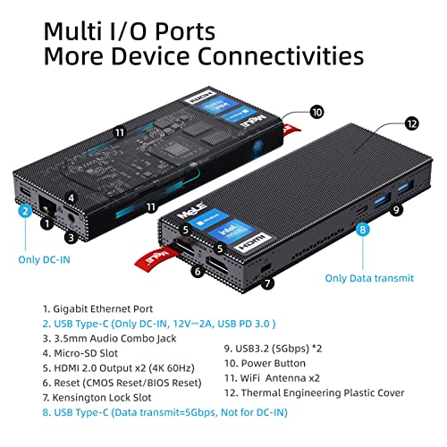 【Reiche E/A-Schnittstellen】Ausgestattet mit 2*USB Typ-C anschlüssen. Einer unterstützt USB PD3.0 Stromeingang. Es ermöglicht den Anschluss einer dritten Stromquelle zwischen 12V und 20V. Wie z.B. ein tragbares Netzteil, Zigarettenanzünder, Außenstrom. Ein weiterer USB-C-Anschluss ist nur für die Datenübertragung, USB3.2 Gen 1=5Gbps. 2.4/ 5.0GHz Dual Band WiFi, Ethernet, BT4.2, 2* HDMI 2.0 (weiblich), 1*2.5mm Audiobuchse, 1*RJ-45 Jack mit realtek RTL8111H, 2*USB3.2 Gen 1=5Gbps, 1* Mico SD Slot.