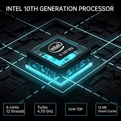 Dieser Mini-PC mit vorinstalliertem Windows 11 Pro ist mit Intel 10. i7-10710U-Prozessor, 6 Kernen 12 Threads, maximaler Turbofrequenz von 4,70 MHz, 12 MB Intel Smart Cache und neuer Hybrid-Core-Technologie ausgestattet, um Speicherplatz für anspruchsvollere Workloads freizugeben. Ultrakompaktes Design, nur 14 x 14 x 4,8cm, bietet eine hervorragende Leistung für eine Vielzahl von Heim- und Geschäftsanwendungen und gewährleistet ein reibungsloses und reaktionsschnelles Erlebnis in einer Vielzahl von Nutzungsszenarien