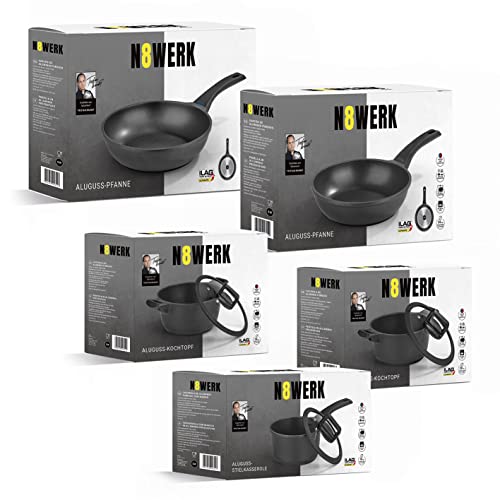 Flexibel: Das N8WERK Aluguss-Topf- und Pfannen-Set ist für alle Herdarten, auch Induktionsherde, geeignet und hält Backofen-Temperaturen von bis zu 150 Grad stand.
