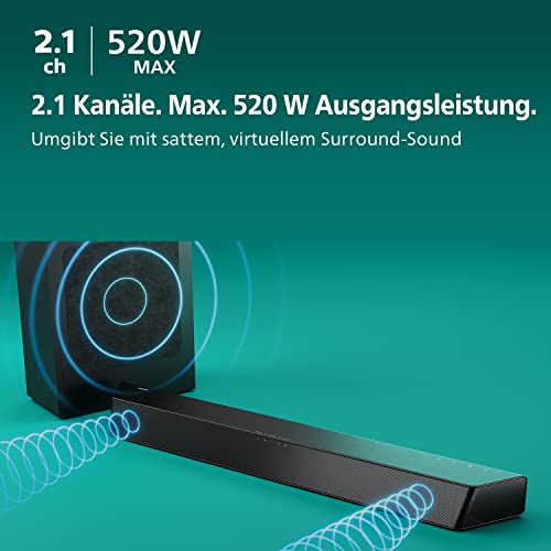 2.1-KANÄLE UND 8″ WIRELESS SUBWOOFER. Diese 2.1-Kanal-Soundbar bietet 520 W Leistung und verfügt über einen leistungsstarken, kabellosen Subwoofer, der Ihnen beeindruckenden virtuellen Surround Sound bietet, ganz gleich, was Sie sehen oder hören.