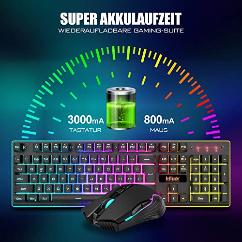 【Hochleistungsfähige kabellose 2,4-G-Tastatur und -Maus】 Suchen Sie nach einer kabellosen Tastatur- und Maus-Kombination, die Arbeit und Spiele perfekt in Einklang bringt? Die wiederaufladbare kabellose RedThunder K10-Gaming-Tastatur und -Maus-Kombination ist die beste Wahl. 2,4 G Hochgeschwindigkeits- und stabile Übertragung sorgen dafür, dass es selbst die intensivsten Kämpfe problemlos bewältigen kann. Hinweis: Der USB-Empfänger befindet sich an der Unterseite der Maus.