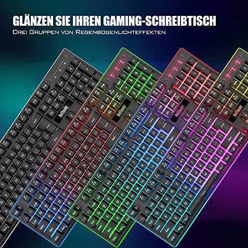 【Tastatur und Maus aufleuchten Die Tastatur verfügt über integrierte drei Gruppen von Regenbogen-Hintergrundbeleuchtungseffekten, unterstützt 2 Atemmodi, 3 statische Modi und 4 Helligkeitsstufen. Das leuchtende Design von Buchstaben, Logo, Lücken und Umgebung macht sie zur besten beleuchteten kabellosen Tastatur auf dem Markt (Hinweis: Aufgrund der Kontrollleuchte gibt es in der rechten oberen Ecke kein Umgebungslicht).