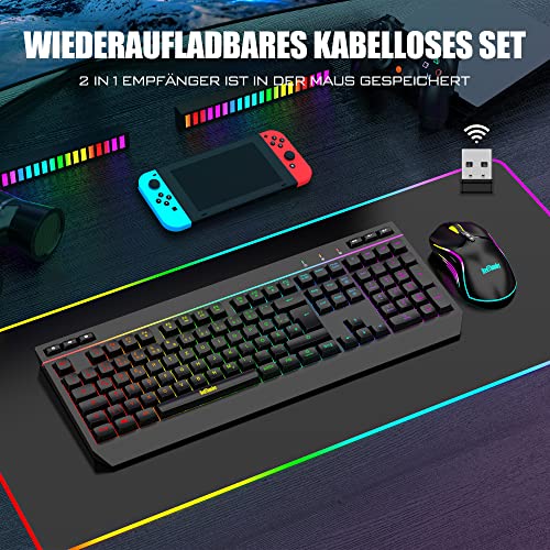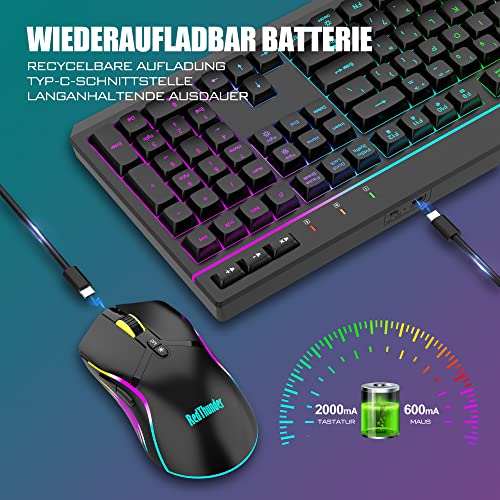 【Hochleistungsfähige kabellose 2,4-G-Tastatur und -Maus】 Suchen Sie nach einer kabellosen Tastatur- und Maus-Kombination, die Arbeit und Spiele perfekt in Einklang bringt? Die wiederaufladbare kabellose RedThunder K20-Gaming-Tastatur und -Maus-Kombination ist die beste Wahl. 2,4 G Hochgeschwindigkeits- und stabile Übertragung sorgen dafür, dass es selbst die intensivsten Kämpfe problemlos bewältigen kann. Hinweis: Der USB-Empfänger befindet sich an der Unterseite der Maus.