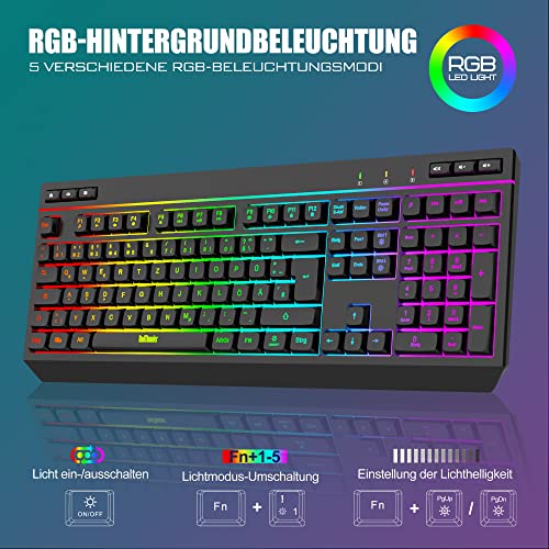 【Leichte Tastatur und Maus】RedThunder K20 Tastatur eingebaut 5 Lichtmodi, 7 statische Modi, 4 Helligkeitsstufen. Die Maus enthält 8 Lichtmodi, die mit einem Klick umgeschaltet werden können. Charakteristische Lichtleisten und dynamische RGB-Lichteffekte beleuchten Desktop-Setups.