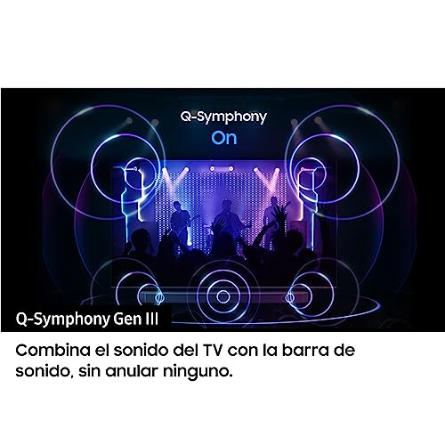 Q-Symphony Gen II: Genießen Sie alle Lautsprecher auf einmal. Diese exklusive Samsung Technologie kombiniert den Sound des TV mit der Soundbar, ohne die Soundbar zu überbrücken.