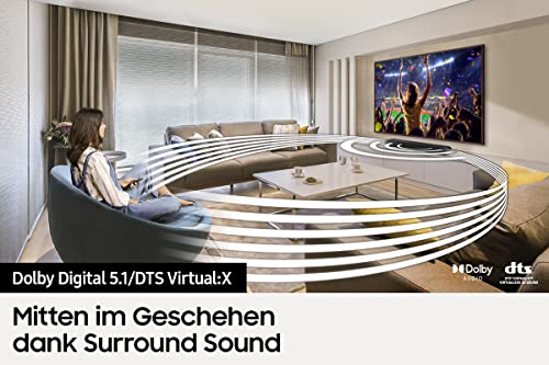Genieße kompakten und zugleich kraftvollen Sound, der gut mit deinem schlanken Fernseher harmoniert. Für satten und natürlichen Klang überall im Haus. DTS Virtual:X sorgt für voluminösen 3D-Sound, der mithilfe von objektbasierten Audiotechnologien auch das Gefühl von Höhe simulieren kann, ohne dafür nach oben abstrahlende Speaker zu benötigen. Genieße die Harmonie zwischen Samsung TV und Soundbar. Q-Symphony sorgt dafür, dass alle Lautsprecher des TVs und der Soundbar gut aufeinander abgestimmt werden und den Sound gleichzeitig aus beiden Geräten wiedergeben. Das erzeugt einen überzeugenden Surround-Effekt, ohne dass man die Fernsehlautsprecher stumm stellen muss.