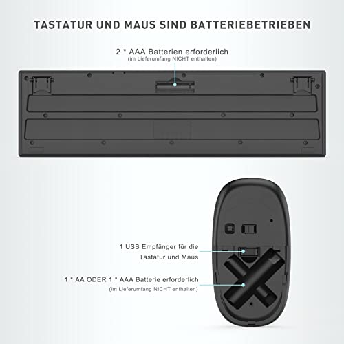 【Batteriebetrieben und Garantie】Diese seenda Tastatur ist mit 2 AAA Batterien und die Funkmaus mit 1 AAA Batterie ODER 1 AA Batterie betrieben(Die Batterien sind NICHT im Lieferumfang enthalten). Wenn Sie jede Frage mit dem Produkt in der zwei jährigen Garantie haben, kontaktieren Sie bitte unser Kundenservice, um Ihre Probleme 100% zu lösen.