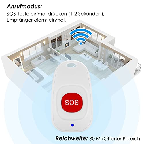 【Notrufknopf FüR äLtere Menschen】: Der Notrufknopf kann überall getragen werden und ist einfach zu bedienen. Der Panikknopf für Senioren ist immer griffbereit und geht selten verloren. Notfall durch Drücken der SOS-Alarmtaste (1-2 Sekunden), der Empfänger ertönt einmal einen Alarm. Wenn Sie einen kontinuierlichen Alarm benötigen, drücken Sie bitte wiederholt die SOS Taste.