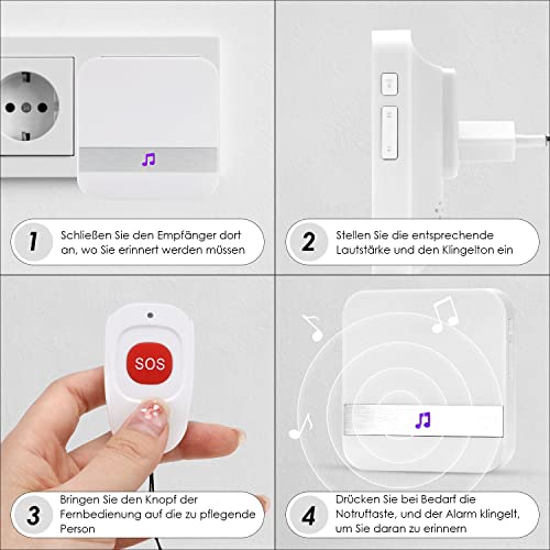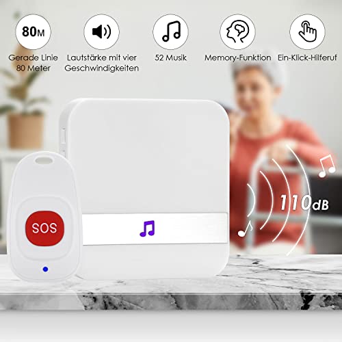 【Senioren Notruf】: Der Ton der notrufknopf für senioren kann sich bis zu 80 m ausbreiten, und 52 Alarmklingeltöne stehen für verschiedene Auswahlmöglichkeiten zur Verfügung. Das Sound-Dezibel kann selbst eingestellt werden, von 0 dB bis 110 dB, einstellbar in 4 Stufen, mit starker Raumdurchdringung.Bis zu 80 Meter Reichweite im offenen Bereich (Wände und andere Objekte reduzieren die Reichweite), keine Interferenzen durch andere Geräte.