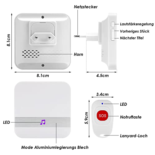 【Praktisches Alarmanlage】: Der Haus notrufknopf für senioren ist wasserdicht und kann sowohl als senioren notruf Alarm als auch als türklingel kabellos verwendet werden, geeignet für die meisten Szenarien Häuser, Krankenhäuser, Gemeinden, Restaurants, Büros usw. Es kann als Geschenk ohne ständige Pflege verwendet werden und kann als Sicherheitsgarantie für ältere Menschen zu Hause verwendet werden.