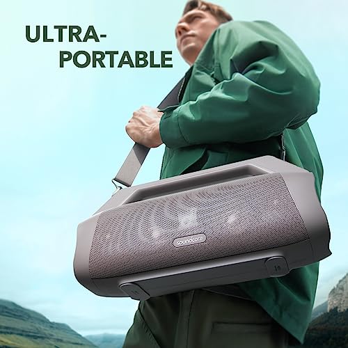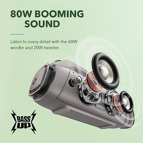 DER SOUND FÜR DRAUßEN: Mächtiger 80W Sound wird von zwei 30W Woofern und 10W Hochtönern geliefert, während mit unserer hauseigenen BassUp-Technologie von Soundcore intensivierte Bässe in Echtzeit zu hören sind. Um die Höhenleistung des Outdoor-Lautsprechers Motion Boom Plus zu verbessern, sorgen Titantreiber für einen rundum raumfüllenden Klang.