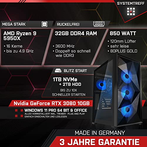 SYSTEMTREFF® High-End Gaming PC AMD Ryzen 9 5950X 16×4.9GHz | Nvidia GeForce RTX 3080 10GB DX12 | 1TB M.2 NVMe + 2TB HDD | 32GB DDR4 RAM | WLAN Desktop Computer Rechner für Gamer, Zocker & Streamer