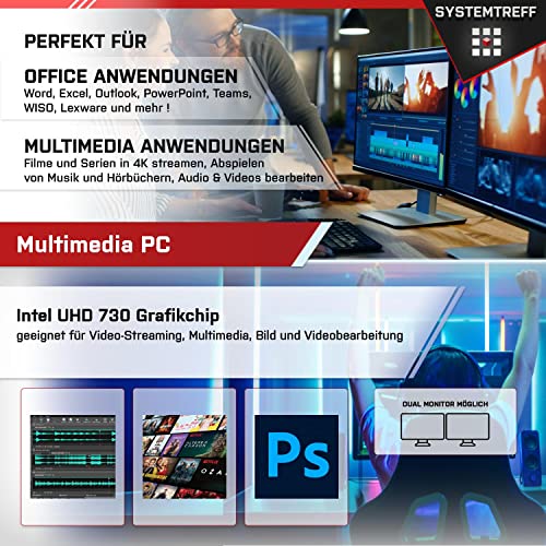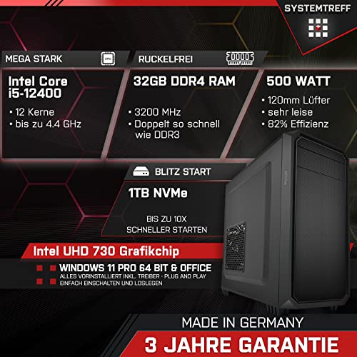 SYSTEMTREFF® Office Komplett PC Set Intel Core i5-12400 12×4.4GHz | UHD 73 4K HDMI DX12 | 1TB M.2 NVMe | 32GB DDR4 RAM | WLAN Silent Desktop Paket Computer Rechner für Büro Business Multimedia