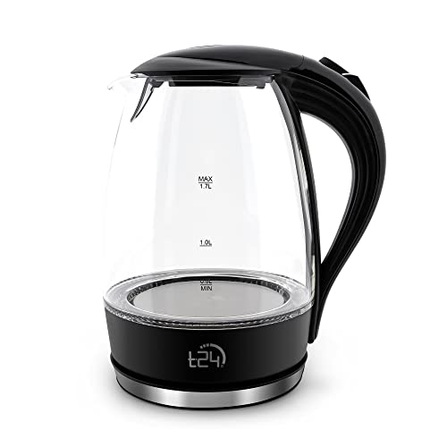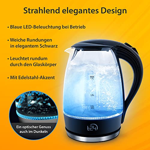 [Hochwertige Anfertigung] Der T24 Glas Wasserkocher ist TÜV Rheinland GS Zertifiziert (ID:1111227953) | setzt sich aus einer harten transparenten Schicht Borosilikatglas und einen Griff, sowie einen Sockel, aus hochwertigen Polypropylen zusammen.