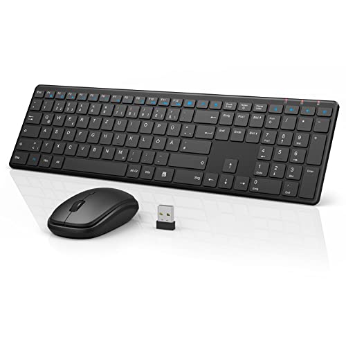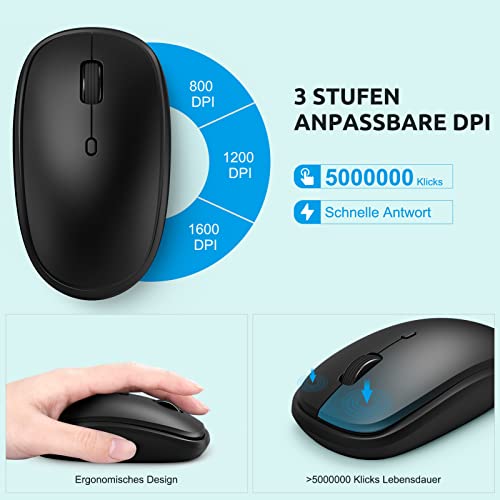 【Kompatibilität & Betrieb】Das kabellose Tastatur und Maus Set unterstützt die meisten Geräte und Betriebssysteme mit einer USB Schnittstelle. Kombination ist mit Windows 10 oder höher, Windows 8, Windows 7 und Chrome OS kompatibel, für Beamer, Chromebooks, Computer, Laptops, Smart TVs geeignet.