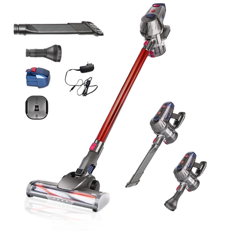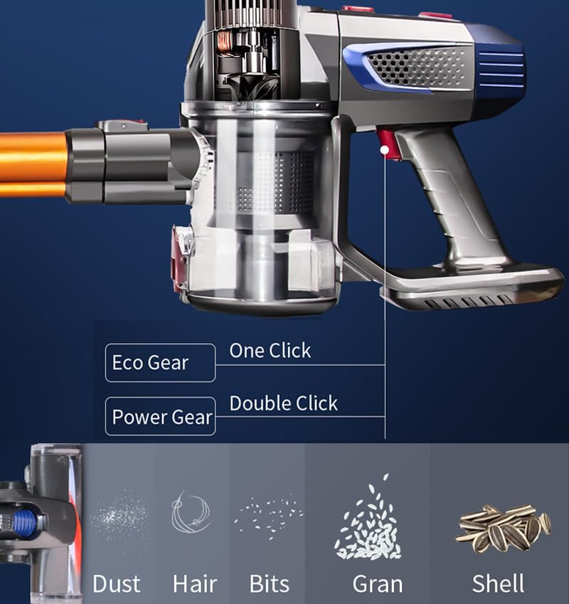 【Langlebiger Akku und weit anwendbare zwei Modi】 Der kabellose Staubsauger ist mit einem 6-Zellen-Akku ausgestattet. Der abnehmbare Akku des kabellosen Staubsaugers kann problemlos überall aufgeladen werden. Der Staubsauger kann 35 Minuten lang im Standardmodus arbeiten und kann frei zwischen den beiden Reinigungsmodi wechseln.
