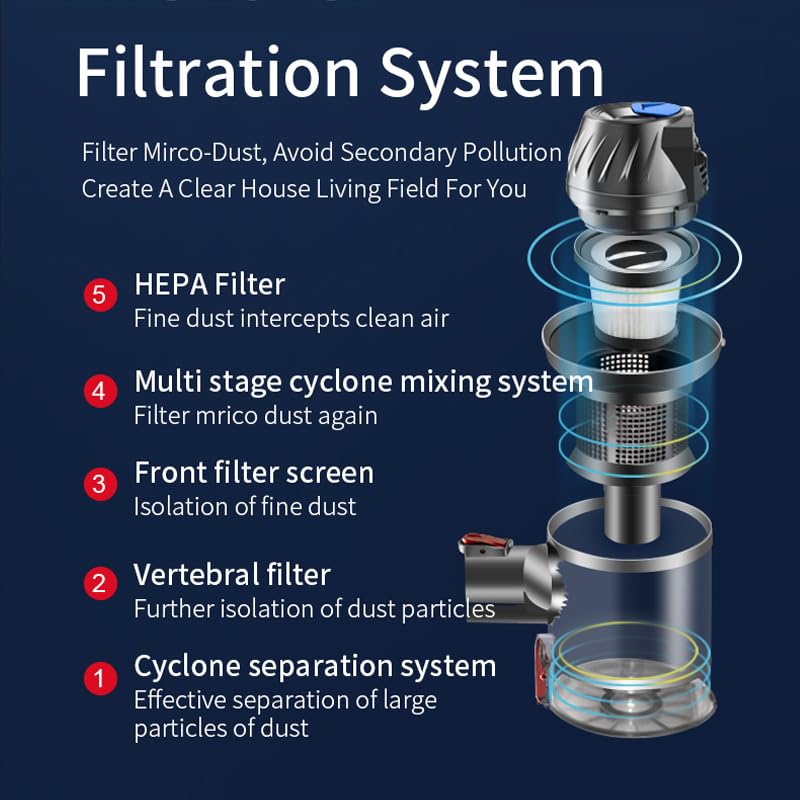 【5-lagiges Tieffiltersystem】 Die Zyklon-Technologie in Kombination mit dem hochdichten Filter im kabellosen Staubsauger kann 99,99% des Feinstaubs und der Partikel entfernen, und die Servicezeit ist doppelt so hoch wie beim traditionellen Filtersystem. Hinweis: Der Filter kann gereinigt und demontiert werden. Regelmäßig reinigen und trocknen, um eine bessere Saugkraft zu erhalten.