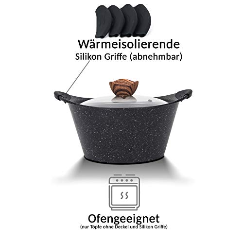 Eigenschaften: hervorragende Wärmeleitfähigkeit und Wärmespeicherung, Antihaftbeschichtung klebt nichts an. Durch die abnehmbaren Silikon Griffe können die Töpfe im Ofen verwendet werden.