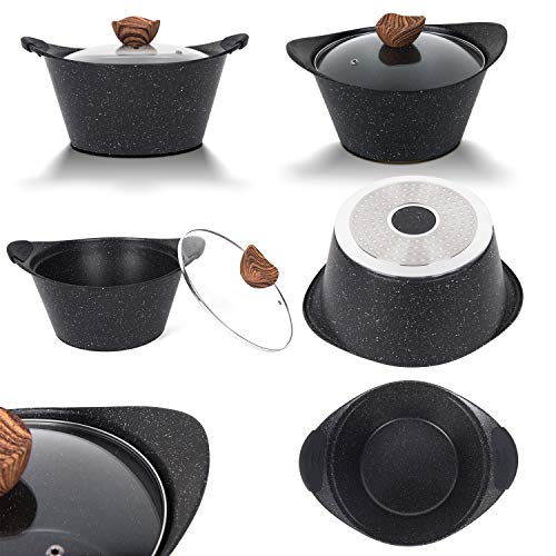 Lieferumfang: 19 Teilig Set Beinhaltet: 1x Kochtopf 20 cm + Glasdeckel (2,0 L), 1x Kochtopf 24 cm + Glasdeckel (4,0 L), 1x Kochtopf 28 cm + Glasdeckel(6,4 L), 1x Bratpfanne 24 cm, 1x Bratpfanne 28cm, 2x Bakelite-Matten schwarze Unterleger, 1x Pfannenwender, 1x Suppenkelle, 1x Spagettilöffel, 6x abnehmbare Silikonhülsen-Griffe