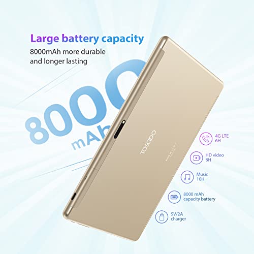 【10,1 Zoll Touchscreen & Dual-Kamera & WiFi & Bluetooth 5.0】 Das TOSCIDO Tablet ist mit einem neuen 2,5 HD IPS-Bildschirm ausgestattet, ein innovatives Touchscreen-Erlebnis und neue Augenschutzfunktionen. Ausgestattet mit einer 5 MP Frontkamera und einer 8 MP Rückkamera mit Blitz. Das Tablet unterstützt 2,4 GHz WLAN mit guter WLAN-Stabilität. Bluetooth 5.0 ermöglicht es Ihnen, Kopfhörer, Tastaturen, Mäuse und andere Geräte einfach anzuschließen