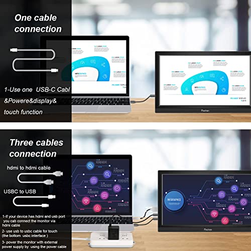 【Plug-and-Play Monitor】: Sobald Sie einen tragbaren Monitor an Ihren Computer oder Ihr Mobiltelefon anschließen, wird er identifiziert und sollte sofort anfangen zu arbeiten.Verbinden Sie mit dem voll ausgestatteten USBC-Gerät, brauchen Sie nur ein USBC-zu-USBC-Kabel zu verwenden, um die Berührung zu erreichen &Power und Signalübertragung