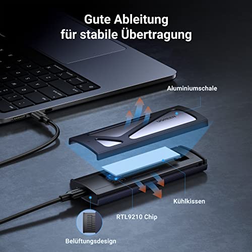 Bessere Wärmableitung: Das hochwertige Aluminiumgehäuse von M.2 Gehäuse bietet dieser M.2 SSD Adapter eine hervorragende Wärmeableitung. Das eingebaute Kühlkissen können der Festplatte helfen, Wärme besser abzuleiten und die Festplatte effektiver zu schützen.