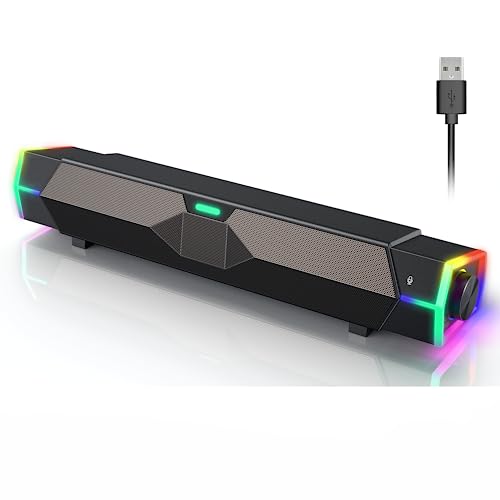 ♪【Einfach zu bedienen】1 Taste der Lautsprecherbalke machen es einfach, auf verschiedene Funktionen zuzugreifen, je nach Bedarf. Das kompakte Design passt überall wie Wohnzimmer, Büro, Arbeitszimmer und einzigartiges Design erleichtert Ihnen die Bedienung. Lange Drücken zum Ein-/Ausschalten, ein Klick zum Umschalten der RGB-Beleuchtung, Doppelklick zum Umschalten des Bluetooth/Wired Mode, Drehknopf zur Lautstärke hoch/runter.