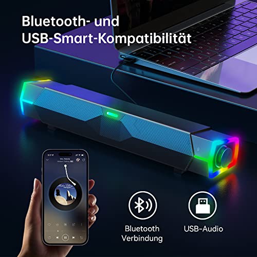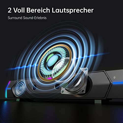 ♪【2 Wege zur Verbindung】: Die Bluetooth Computer Soundbar unterstützt sowohl Bluetooth 5.0-Verbindung als auch USB-Verbindung, Plug and Play mit breiter Kompatibilität. PC-Lautsprecher für Computer, Laptop, Tablet, Monitore, Smartphones und TV. Der Modus-Schalter kann durch Doppelklick auf die rechte Taste gesteuert werden.