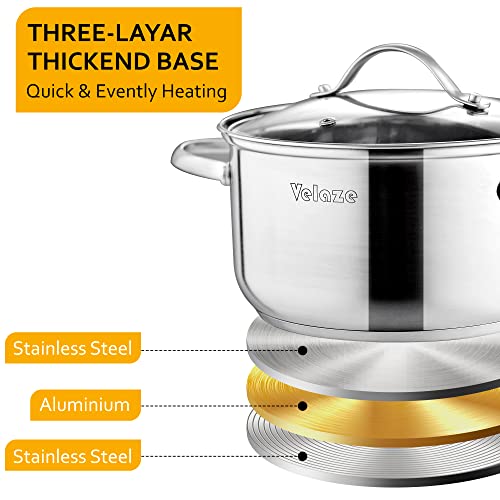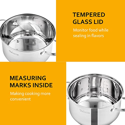 HERVORRAGENDE KOMPATIBILITÄT – 3-Schicht-Konstruktion im Boden (eine Schicht aus reinem Aluminiumkern zwischen zwei Edelstahlschichten) sorgt für eine optimale Wärmeverteilung und ist mit Gas-, Induktions- und Elektrokochfeldern kompatibel. Durch den flache Boden eignet sich das Topfset auch für Glas- und Keramikkochfelder.