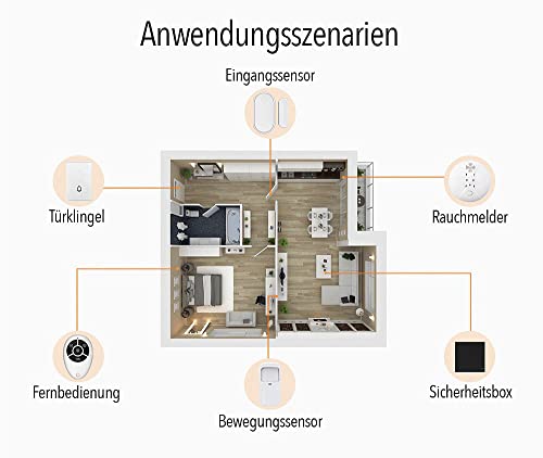 Funk-Verbindung (433 MHz) aller Komponenten • Bequeme Konfiguration über Smartphone-App • Kompatibel mit Amazon Alexa: Alarmanlage per Amazon Echo und kompatiblen Lautsprechern per Sprachbefehl ein- und ausschalten • Kompatibel zum Smart-Life-System: ELESION- sowie Smart-Life- und Tuya-Geräte können auf Wunsch zu einem Smarthome-System kombiniert werden