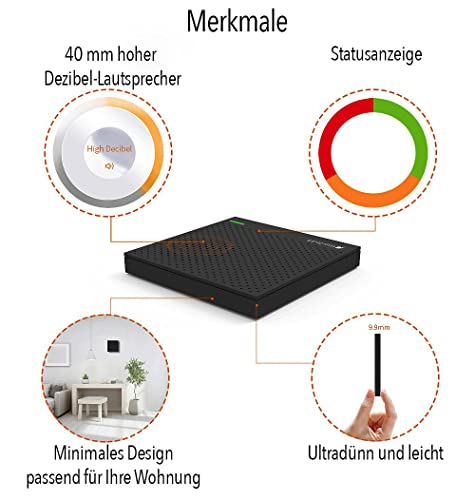 Besonders dünn und mit integriertem Akku • Unterstützt bis zu 50 Sensoren • Integrierte Sirene für Alarmton mit bis zu 80 dB • Auch als Türklingel verwendbar: 32 integrierte Melodien • Kostenlose App ELESION für weltweiten Zugriff, Steuerung und mehr • Voll kompatibel zu Geräten mit Smart-Life- und Tuya-App