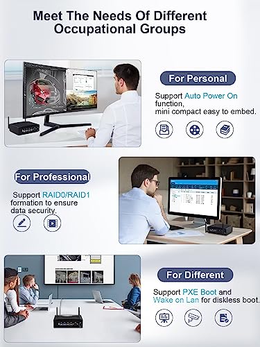 【Stabile Verbindungen und zukunftssicher】➨ Bleiben Sie mit Dualband-WLAN, Dual-Gigabit-Ethernet und Bluetooth in Verbindung. Genießen Sie stabile und reibungslose Übertragungs- und Downloadgeschwindigkeiten. Dieser lüfterlose Mini-PC unterstützt Linux OS, Wake On LAN, Auto Power On, RAID und PXE. Es ist leistungsstark genug, um leichte Spiele, Bildbearbeitung und Web-Browsing zu unterstützen. Genießen Sie lebenslangen technischen Support und einen 3-Jahres-Zufriedenheitsservice.