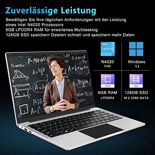 WOZIFAN Win 11 Laptop 14 Zoll 6GB RAM 128GB SSD Unterstützung 1TB SSD Erweiterung Traditioneller Full Metal 2.4G+5G WiFi Bluetooth 4.2 USB HDMI 1920×1081 FHD PC mit Drahtloser Maus-Silber